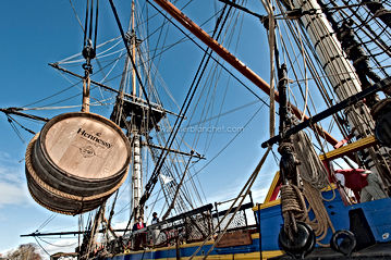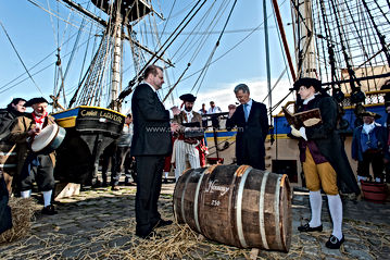 Chargement de barriques de cognac Hennessy à bord de l'Hermione à destination des Etats-Unis en présence d'officiels (maires, ancienne ministre, ambassadrice des USA,...) // La Rochelle - 13 mars 2015