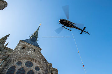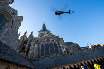 Opération de levage orchestrée par la compagnie aérienne Héliberté pour la rénovation du cloître du Mont Saint-Michel