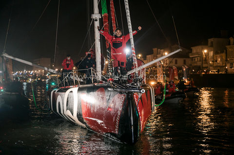 Après des semaines de navigation autour du globe, ils sont enfin de retour aux Sables - Passage de la ligne, remontée du chenal, 1ers mots au ponton et moment d'intimité avec la famille avant la traditionnelle conférence de presse // Les Sables d'Olonne (85), de janvier à mars 2021