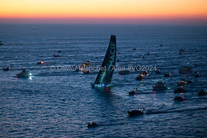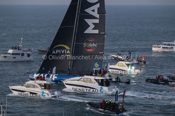 Arrivée victorieuse de Charlie Dalin sur MACIF dans le Vendée Globe 2024 - Après 64j 19h 22m 49s de mer, le marin normand prend sa revanche sur l'édition 2020 et s'offre la ferveur d'un chenal bondé // Les Sables d'Olonne (85) - 14 janvier 2025
